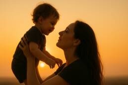 - Un text care descrie: „Ea își ridică fiul în brațe după luni întregi de așteptare. Lacrimile îi curgeau pe obraji, iar copilul râdea în hohote, cu brațele întinse.”